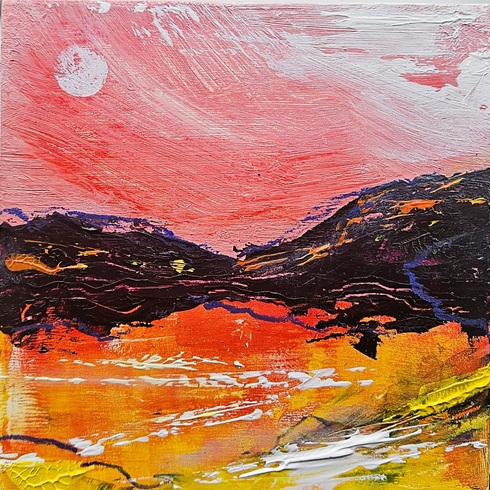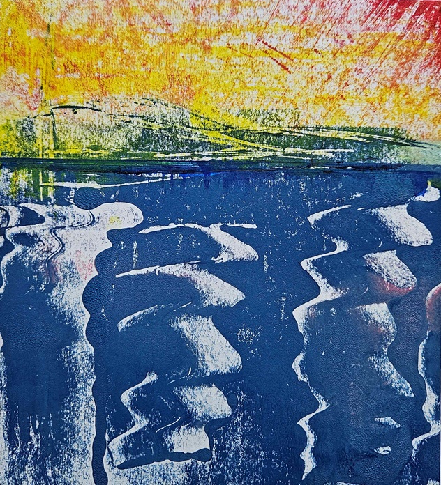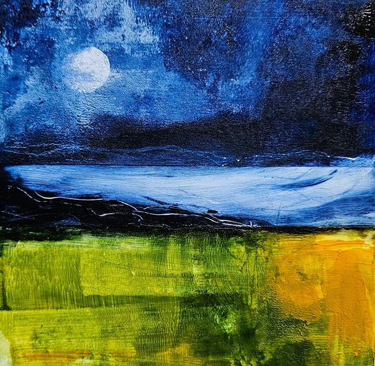 Her body of work is a profound emotional response to the world around her, both landscape and seascape. A memory is evoked, both of the image and its inner emotional resonance and is expressed through the use of colour and bold mark making. Energy charging, strong brush strokes. Layers of paint are scraped back, more paint applied. This process depicts the evolution of nature and the human spirit. Our combined interconnected vulnerability. The fragile threads that bind us.