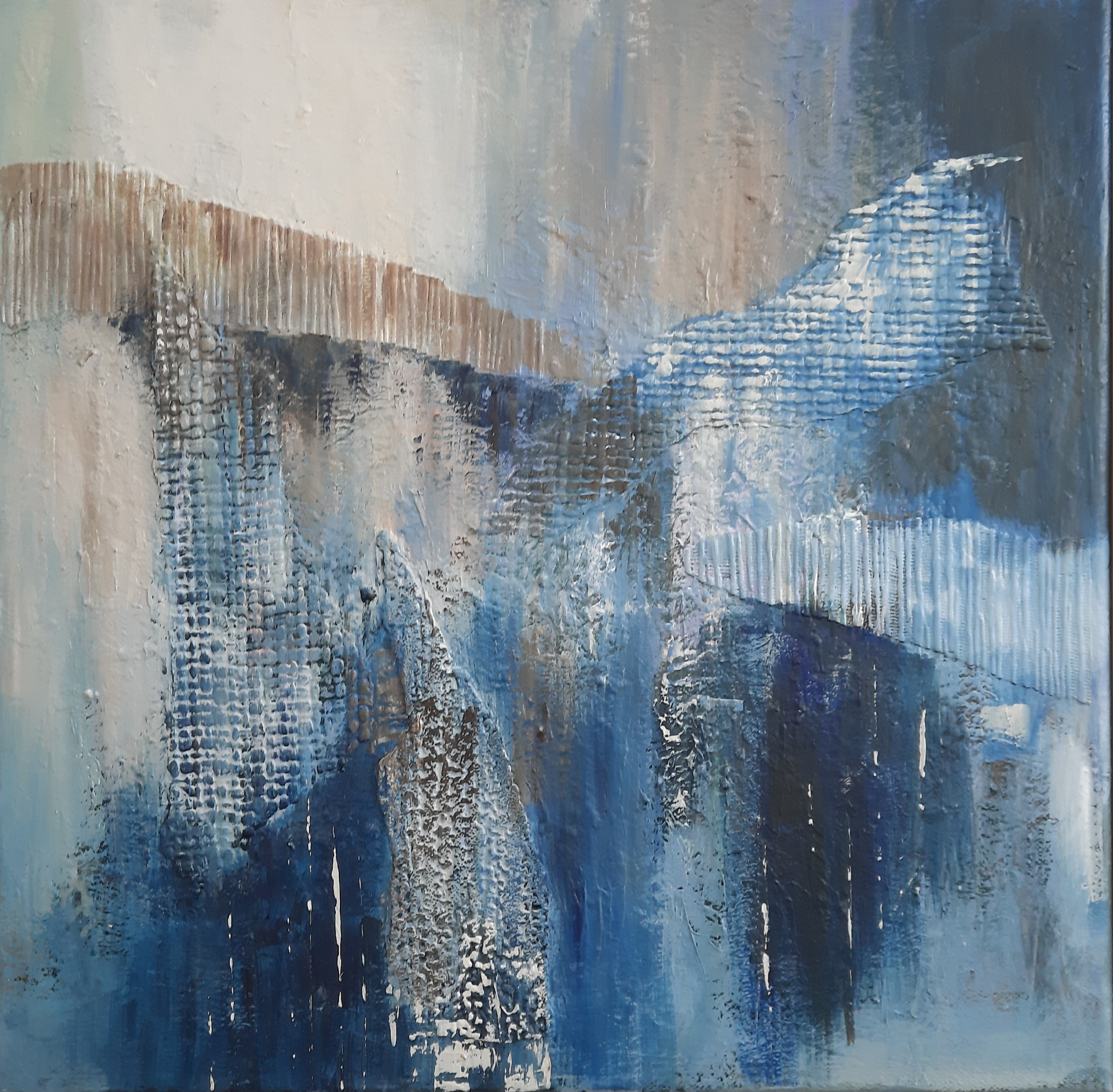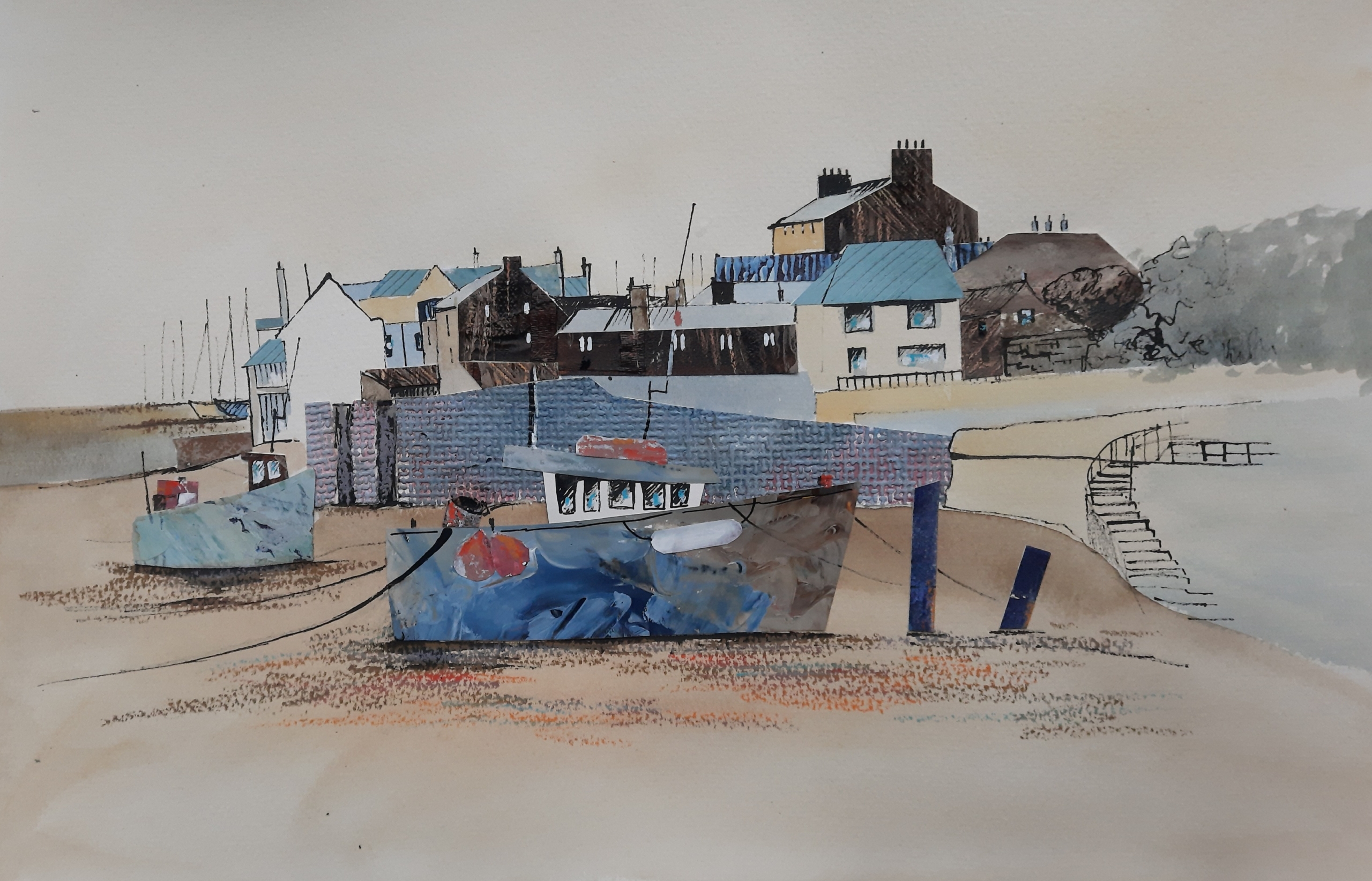 Joan’s work is inspired by recollections of the local countryside and coast. She uses collage to create something new, and is trying to translate memories of past experiences into visual form. She lets the painting lead the way so its creation becomes a journey of discovery until the final image emerges.