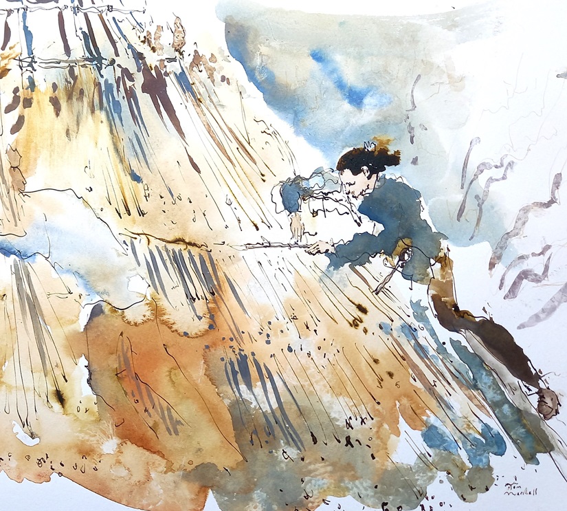 Tom Marshall likes to cycle out to somewhere to draw and paint on the spot, or work from his drawings and imagination in the kitchen at home, making woodcuts, monoprints and other kinds of press-less printmaking. He enjoys variety in the materials he uses and the subjects he chooses, but many of his pictures feature people in the local places he’s drawn them, and often dogs and birds. He loves drawing people and creatures and trying to capture movement and moments.